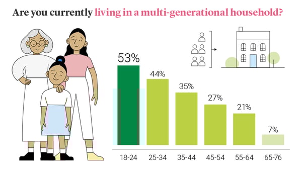 - Cultural trends. We found that 16% of respondents live in a multi-generational household due to ‘cultural traditions and expectations’, rising to 24% among younger millennials (25-34 years olds).