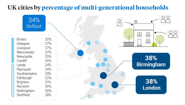 - Regional differences. London and Birmingham are the cities with the highest rates of multi-generational living. In both cities, 38% of residents said they live in this type of household.
