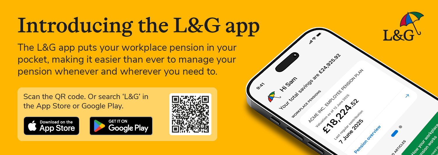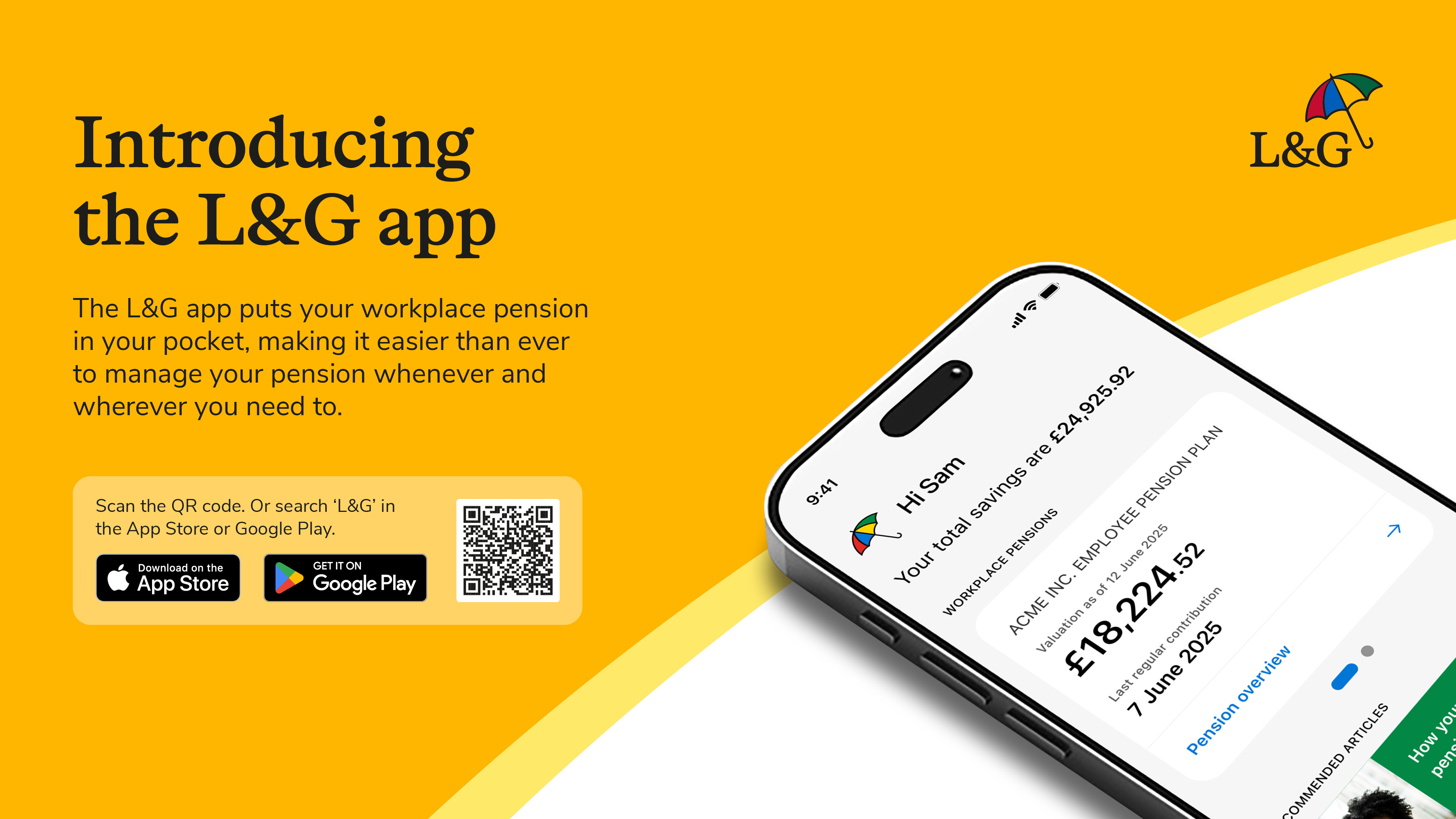 L&G app appears with the caption ‘Your money is just a few taps away’, using a blue background.