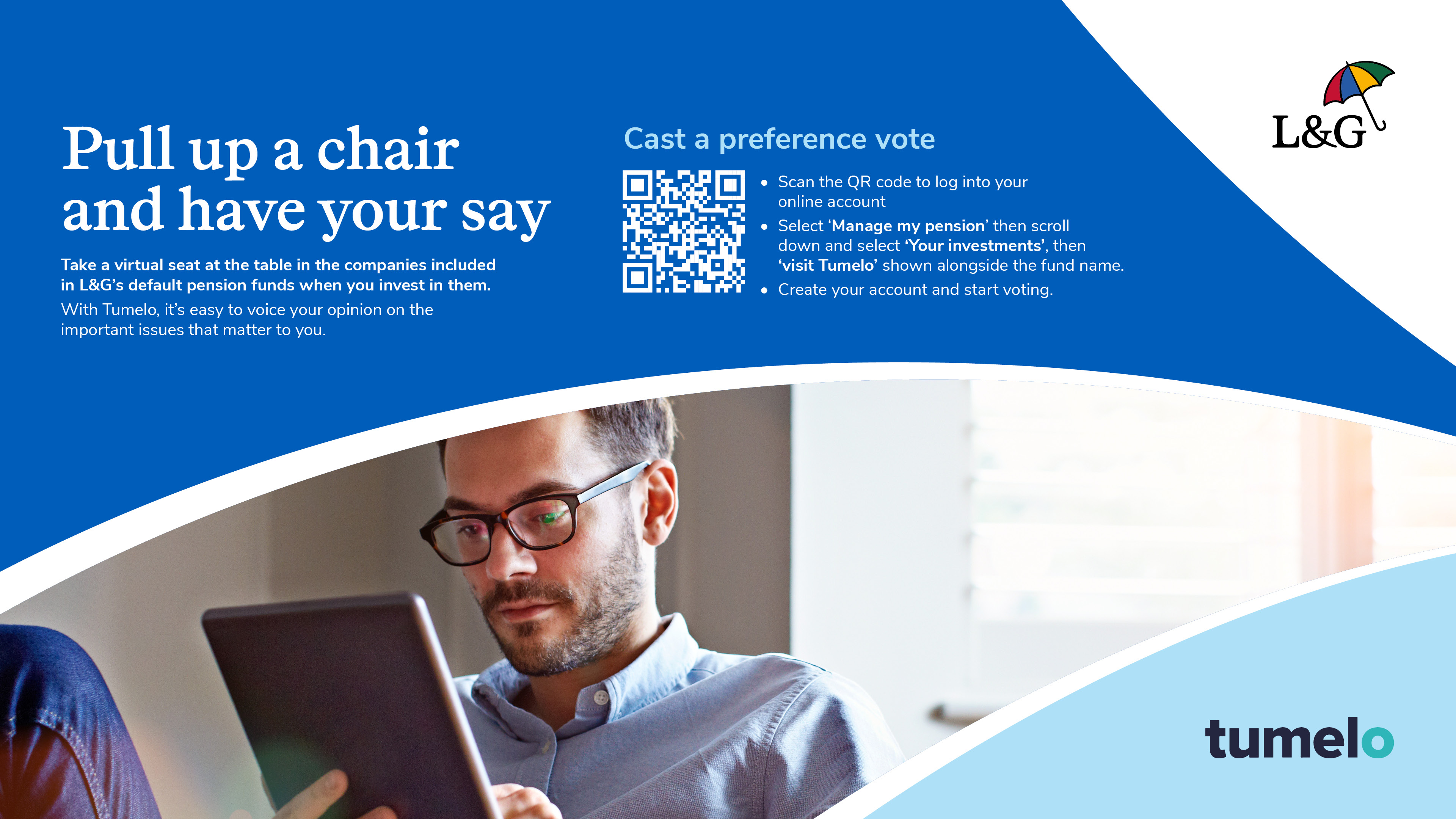 The campaign provides detail on the Tumelo platform, which employees in these L&G default pension funds can now access from their online account. Tumelo lets employees see which companies their fund(s) are invested in and have a say on issues related to how the companies are run.